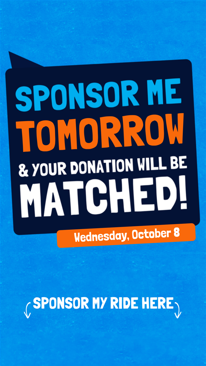 Add these to your Instagram, Facebook or TikTok to let everyone know about this one-day donation matching offer (Wednesday, October 8). Make sure you add your rider link to your Instagram bio so people can easily sponsor you!